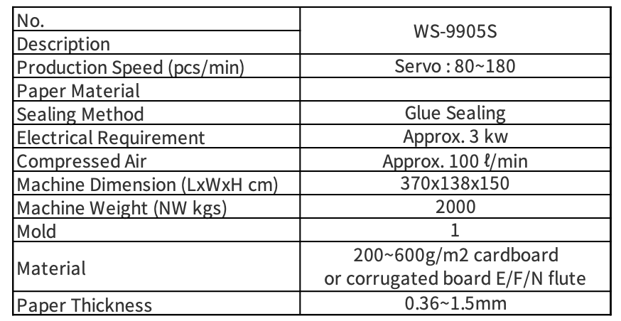 • 【WS–9905S】Machine de montage de boîtes de papier à emporter à grande vitesse - Collage de colle (voie unique)